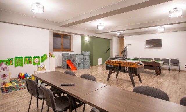 • Świetlicę/ salę sportową gdzie znajduje się bilard, piłkarzyki, miejsce do wieczornych spotkań.
